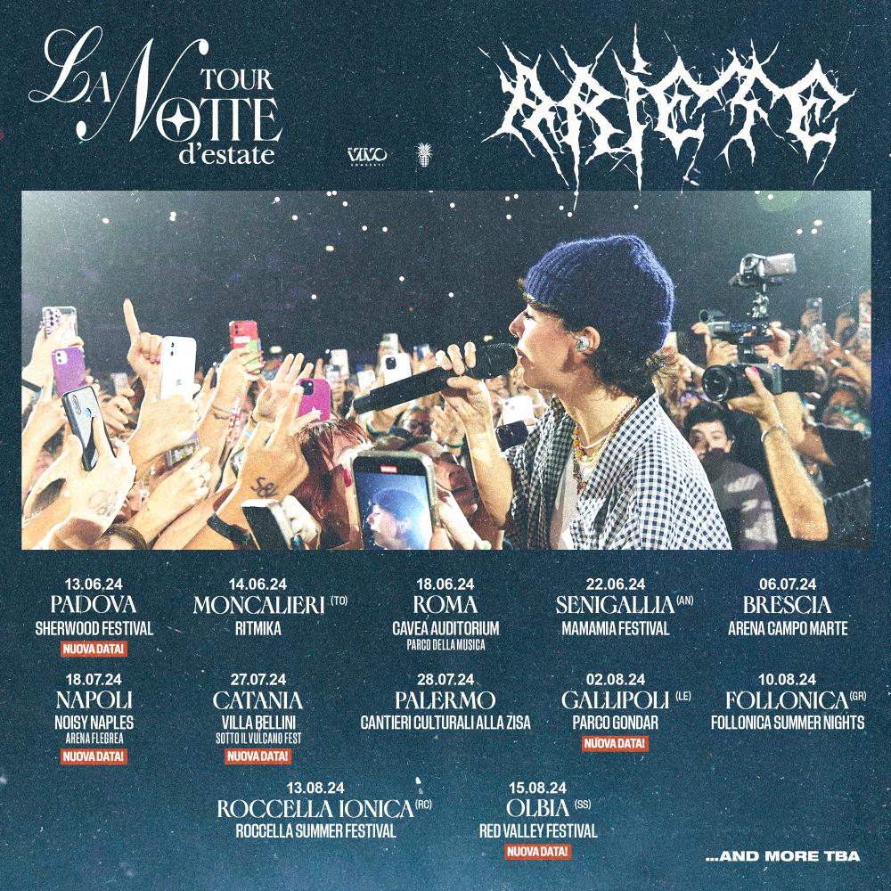 Dopo aver incantato il pubblico in palazzetti di tutta Italia, ARIETE risponde alle numerose richieste annunciando l’aggiunta di 5 nuove date a Padova, Napoli, Catania, Gallipoli e Olbia, nel contesto del suo tour “La Notte D’Estate”, prodotto e organizzato da VivoConcerti.