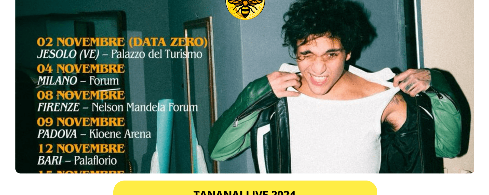 Dopo qualche mese di stop, in seguito a una stagione 2022-2023 di successi, Tananai torna a far suonare la propria musica annunciando il nuovo tour “Tananai Live 2024” nei palasport di tutta Italia il prossimo autunno, nei mesi di novembre e dicembre.
