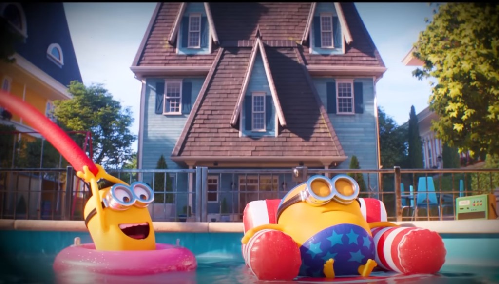 Come al solito, non mancano richiami all’America, che troviamo in una delle scene dei minion. Bob e Stuart stanno prendendo il sole in piscina e Bob è seduto su un materassino, a strisce bianche e rosse, e indossa un costume con delle stelle blu, colori e forme che rimandando alla bandiera americana.
