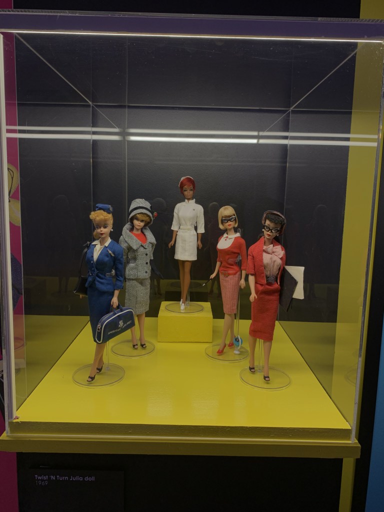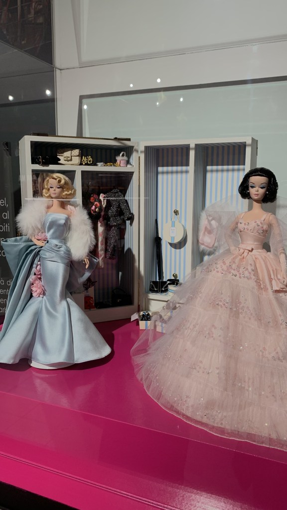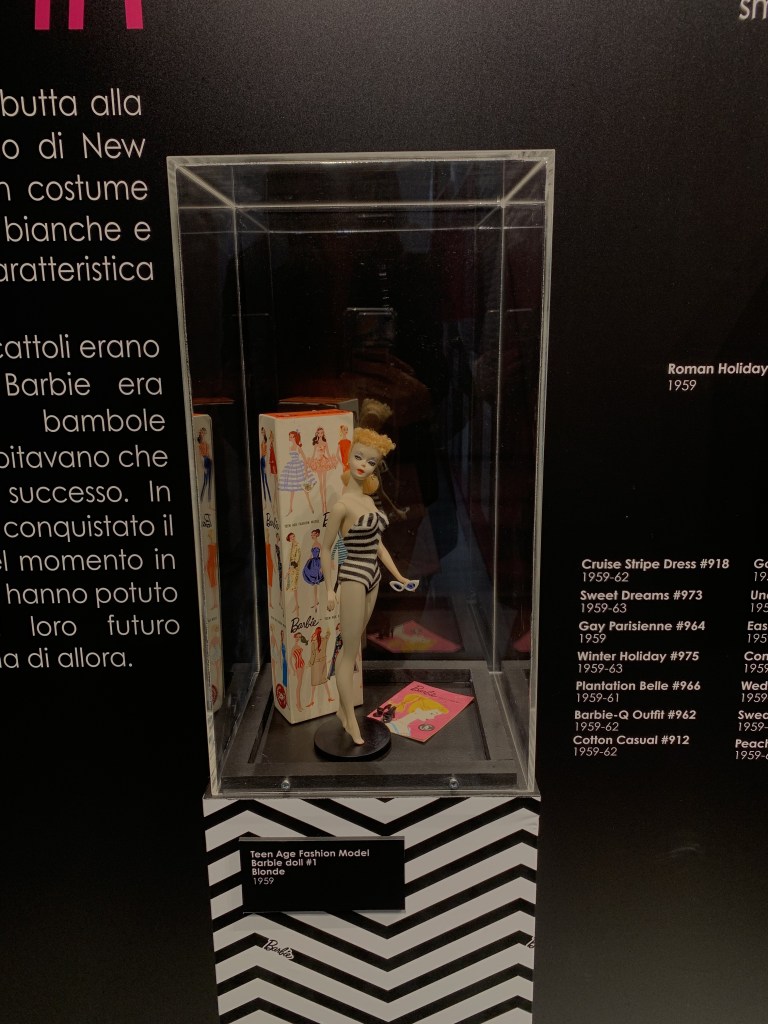 Passeggiare per i corridoi della mostra vi farà ripercorrere la storia della bambola, a partire dalla primissima versione uscita: l’originale del 1959, la bambola con il costume a righe bianco e nero, che vi ricorderete benissimo se l’anno scorso avete visto Barbie al cinema. Da quel momento fu chiaro che Barbie era destinata ad entrare nella storia come un vero e proprio fenomeno rivoluzionario. La storia della bambola ha accompagnato la storia della moda stessa per decenni, tutto ciò che accadeva nella realtà si rifletteva anche negli abiti indossati da Barbie: l’era delle minigonne, gli anni ’60 e la cultura hippie, il debutto delle donne nel mondo del lavoro, i sfavillanti vestiti per gli anni della musica disco e addirittura i viaggi nello spazio. Barbie non ha saltato nessuna tappa e ha accompagnato le bambine nel corso della storia, permettendo loro di identificarsi in un’icona che apriva il loro mondo a mille possibilità diverse.