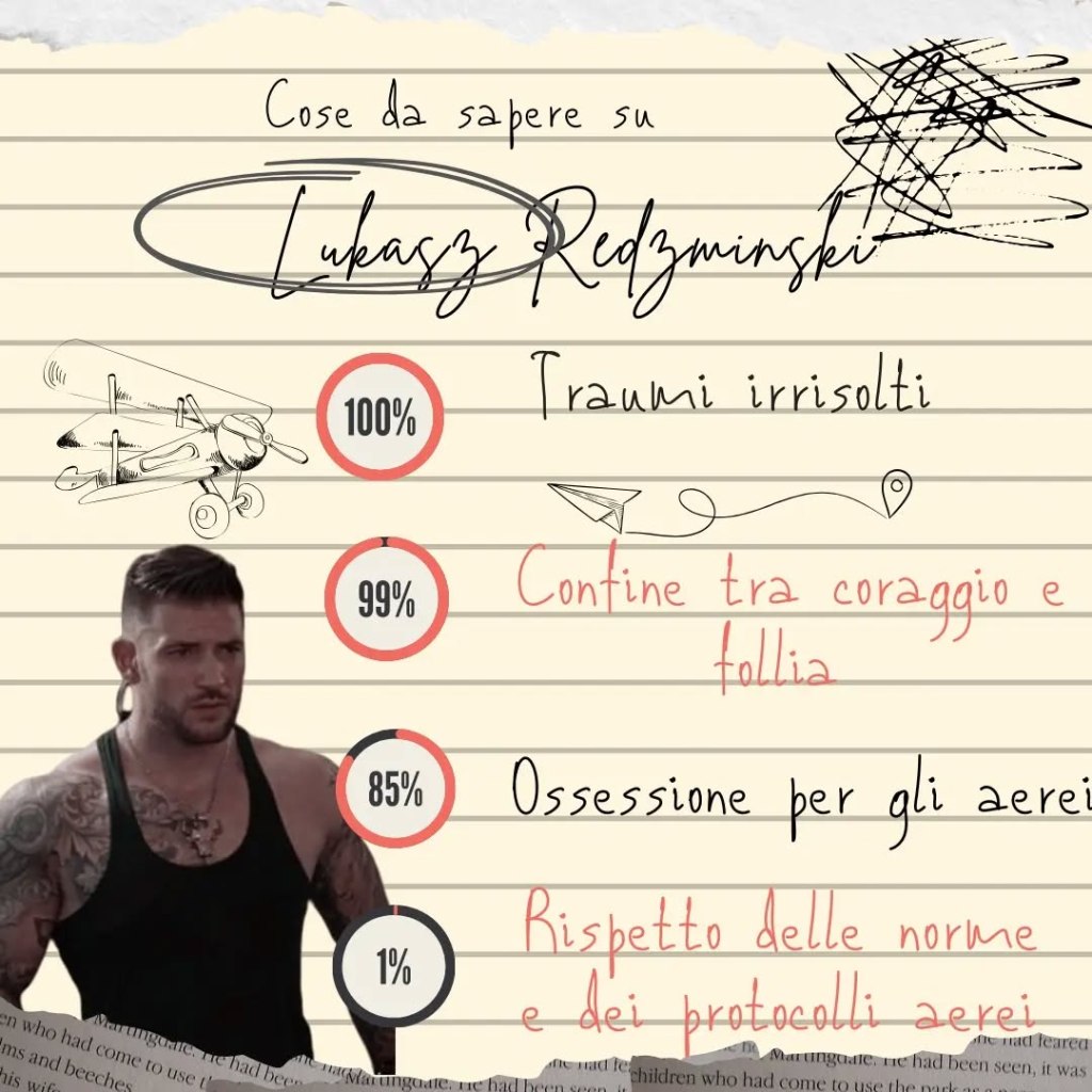 Lukasz Redzminski è un eroe lontano dagli stereotipi: un uomo profondamente segnato dalla guerra, che convive con il peso di decisioni dolorose e memorie che hanno lasciato cicatrici invisibili indelebili. Ex pilota militare della resistenza, Lukasz è tormentato dal senso di colpa per le vite perse durante il conflitto e per quello che sua sorella ha dovuto sacrificare per salvarlo da mani crudeli. La sua mente è un campo di battaglia tra il desiderio di lasciarsi il passato alle spalle e l’ossessione per la giustizia contro i nazisti. Questo trauma lo rende tanto vulnerabile quanto coraggioso, un uomo che, pur con tutte le sue ferite, si getta a capofitto nell’avventura cercando disperatamente di riconciliarsi con se stesso. Speciali i suoi momenti di fragilità: a causa del disturbo da stress post traumatico, Lukasz non sempre distingue la realtà dal passato. Lui guarda il cielo e desidera tornarci, ma, allo stesso tempo, ha paura di quello che potrebbe vedere. Per ancorarsi al presente dorme sempre con un aereoplanino di legno, purtroppo in questa missione lo perde e dovrà “utilizzare” qualcos’altro che lo tenga atterra nelle notti e nei giorni avvenire. Quel qualcosa lo trova in Ewelina.