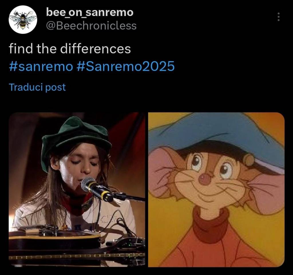 E come non citare Lucio Corsi, che per due sere di fila è riuscito a conquistarsi un posto nella Top 5. In questa seconda serata ha optato per un outfit meno sgargiante rispetto al completo giallo e nero della prima sera, con il quale ha decisamente stupito tutti. Il suo modo di fare e il cappello svasato in testa ci hanno ricordato un personaggio iconico della nostra infanzia: Fievel Toposkowich, l’iconico topolino del film Fievel sbarca in America. Insomma, sono proprio due gocce d’acqua!