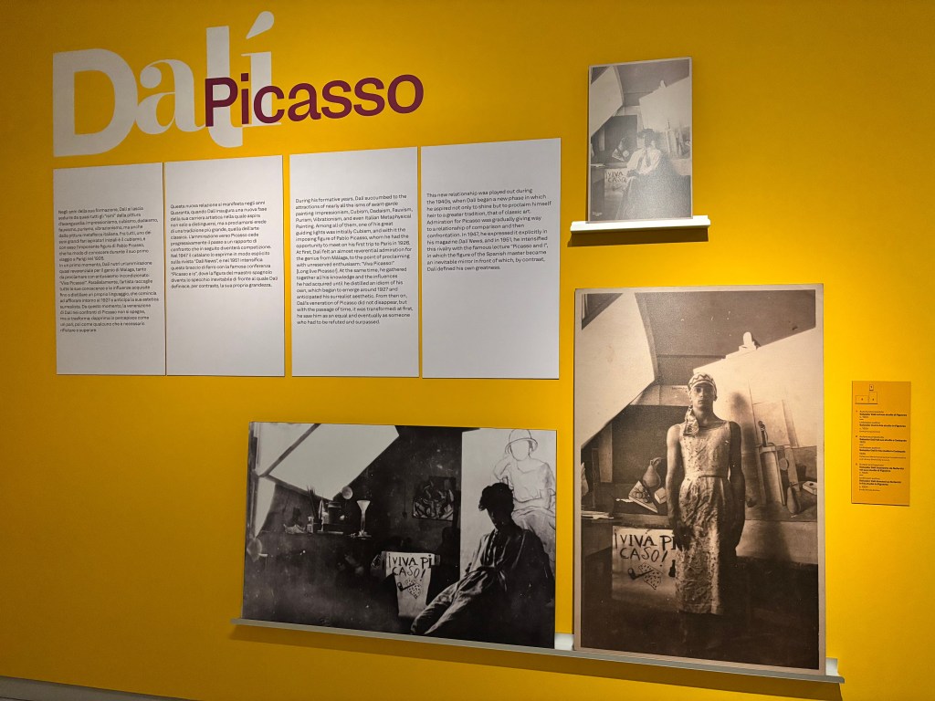 Il percorso espositivo si apre con un’introduzione che delinea sin da subito questa dialettica tra rivoluzione e tradizione. È proprio questa tensione che ha segnato tutta la traiettoria creativa di Dalì, sospesa tra il desiderio di sovvertire e il bisogno di radicarsi nella grande pittura europea. La prima sezione, quella dedicata alla rivoluzione, si concentra sul periodo in cui Dalì si confronta con le avanguardie e con Picasso. La seconda parte è invece dominata dal ritorno alla tradizione: Dalì studia i classici, li assimila e li trasforma. Il tutto è arricchito da materiali documentari, fotografie e rare edizioni originali.