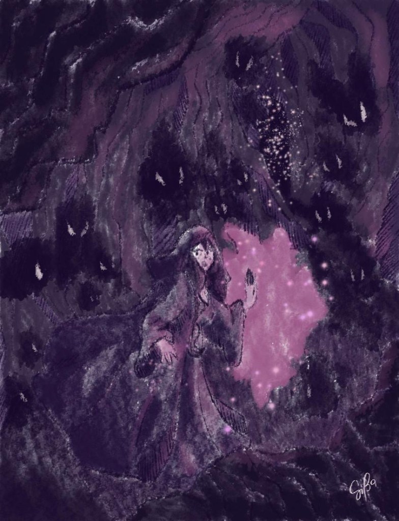 Nell’oscurità di una grotta sta correndo una strega che si fa luce con il suo potere. E’ molto spaventata perché è stata attaccata da spiriti maligni che la stanno inseguendo. Alla fine del sentiero l’attende un varco luminoso simile ad un portale, che forse la salverà.