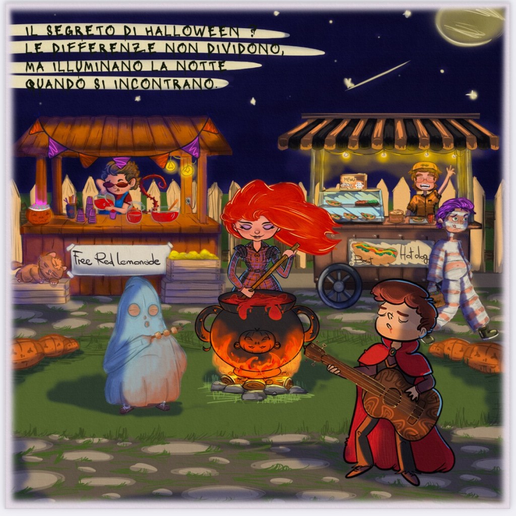 Una piccola scena di festa di Halloween, tra stand, zucche e personaggi tutti diversi che si ritrovano sotto la stessa luna a condividere un luogo, un momento. L’idea è proprio questa: le differenze non dividono ma uniscono e illuminano ancor di più la notte quando si incontrano. (frase presente nell’illustrazione)