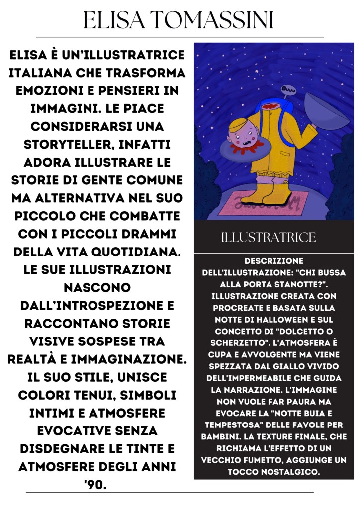 Elisa è un’illustratrice italiana che trasforma emozioni e pensieri in immagini. Le piace considerarsi una storyteller, infatti adora Illustrare le storie di gente comune ma alternativa nel suo piccolo che combatte con i piccoli drammi della vita quotidiana. Le sue illustrazioni nascono dall’introspezione e raccontano storie visive sospese tra realtà e immaginazione. Il suo stile, unisce colori tenui, simboli intimi e atmosfere evocative senza disdegnare le tinte e atmosfere degli anni ’90.