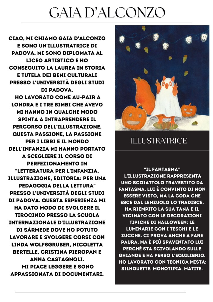 Ciao, mi chiamo Gaia D’Alconzo e sono un’illustratrice di Padova. Mi sono diplomata al Liceo Artistico e ho conseguito la laurea in Storia e Tutela dei Beni Culturali presso l’Università degli Studi di Padova.