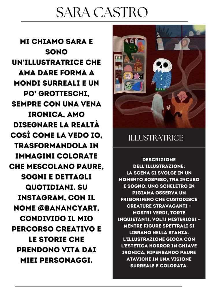 Mi chiamo Sara e sono un’illustratrice che ama dare forma a mondi surreali e un po’ grotteschi, sempre con una vena ironica. Amo disegnare la realtà così come la vedo io, trasformandola in immagini colorate che mescolano paure, sogni e dettagli quotidiani. Su Instagram, con il nome @banancyart, condivido il mio percorso creativo e le storie che prendono vita dai miei personaggi.