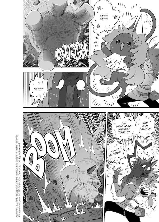 Il tratto di Azzurro Chiara è una sorpresa: dinamico, chiaro, con una regia da vero manga d’azione. Le scene di combattimento hanno impatto e leggibilità, grazie a linee di movimento nette e prospettive che danno profondità. Le creature riempiono la pagina con presenza fisica, mentre le espressioni dei personaggi restano flessibili e vive, capaci di passare dal dramma al comico in un istante. È uno stile che non copia il Giappone, ma ne capisce il linguaggio.