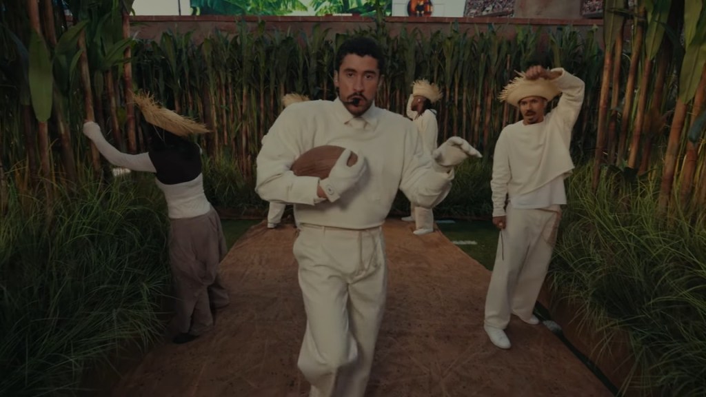 Durante l’Halftime Show, Bad Bunny trasporta il pubblico nella sua Porto Rico, scegliendo di mostrarci la parte più umile e autentica dell’isola caraibica, fatta di persone che lavorano, colori, sapori e musica latina. L’esibizione si apre in una fattoria rurale dove vediamo dei ballerini vestiti da jibaros (braccianti portoricani) al lavoro. Il cantante appare in un elegantissimo completo bianco custom made di Zara, con tanto di guanti, capelli tirati a lucido e una palla da football stretta al petto.