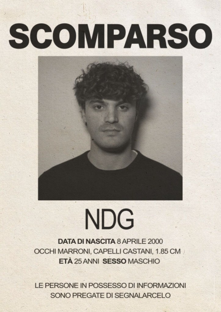 Dopo un periodo di assenza dalla scena musicale NDG torna con un nuovo singolo autoironico. Esce oggi 19 marzo Scomparso, che parte da un’intuizione: trasformare una narrazione subita, amplificata dai social e ridotta a commento in canzone.